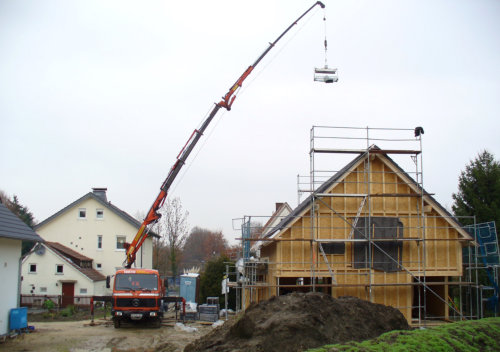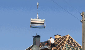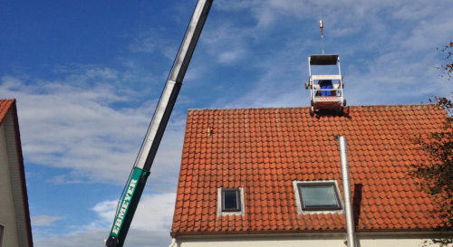 - Solarkollektoren mit dem Kran auf das Dach befördern.- Schornsteinverrohrungen von oben aus dem Personenkorb.