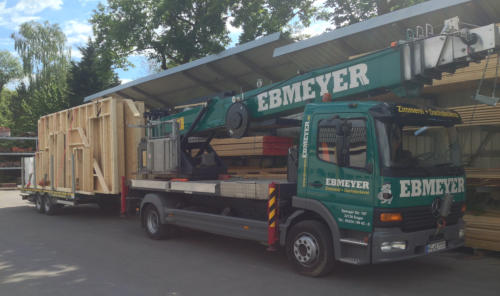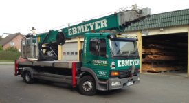 Bereits 1995 wurde der erste Montagekran mit einer Hakenhöhe von 21m angeschafft.Dieser wurde 2006 durch einen Emminghaus E30 Alu-Kran auf einem 7,5t LKW ersetzt.Durch eine Hakenhöhe von 33m und einer Tragkraft von max. 1,5t konnten immer größere Lasten an den Haken genommen werden.Um den immer weiter steigenden Anforderungen weiter gerecht zu werden wurde 2015 ein Emminghaus E36 Alu-Kran für den bisherigen E30 angeschafft. Durch die Montage auf einem 12t LKW, der für die passende Standfestigkeit sorgt und einer max. Tragfähigkeit von 1,9t können nun auch größere Lasten bewegt werden. In Verbindung mit unserem Tieflader können nun auch größere Mengen Material mit zum Einsatzort Transportiert werden.